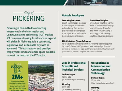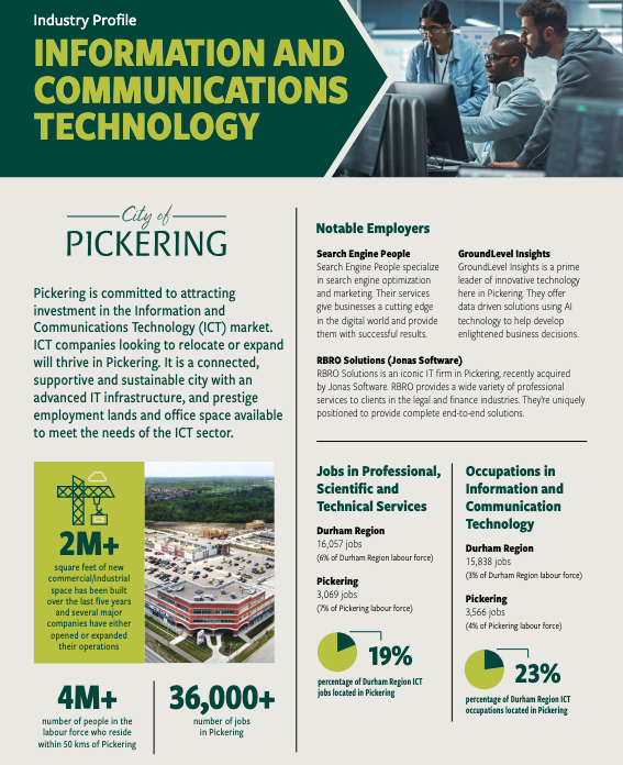 Pickering also borders the City of Toronto, home to Canada's largest ICT sector and third largest in North America, employing over 155,000 individuals.